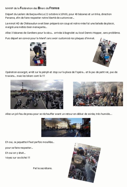 Dimanche matin très tôt (trop tôt pour certain…) il faut rendre le mobil-home et là merci les filles c'est vous qui êtes au top. Départ pour l'ile d'Oléron, emmené facile par notre Road Captain. Bon il n'a pas de mal il est chez lui notre Dédé (il pourrait rouler les yeux fermés, le bougre). Petit resto de fruit de mer, un petit tour chez un autochtone (merci Jean pour ton accueil) petite ballade avec plaque d'immatriculation volante (cette fois le clin d'œil c'est pour toi Vice-Prez), installation du campement chez notre frangin, et puis c'est resto, La Guitoune une adresse à connaître sur l'ile. Longue soirée à nouveau… whisky, cigares et petites pépées !!! (ah non, elles sont couchées - n'est ce pas Gloria…MDR). Lundi 27, après le ptit déj de Boris, retour sur Prunay-le-Gillon sans escale avec quelques averses entrecoupées d'ondées elle mêmes entrecoupées de pluie… retour sans problème avec un petit diner improvisé au local, avec terrine et huitres de Marennes Oléron bien sur… Pour résumé : Un bon… un très bon 22ème Show Bike Aquitaine. Pat le secrétaire.