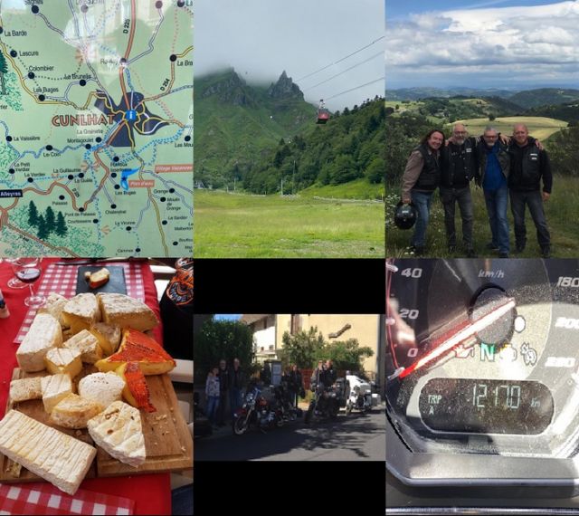 |  WEEK-END 06/2020 en Auvergne | Ah l'Auvergne ! ses montagnes, ses cols, sa verdure, ses routes sinueuses, ses lacs, ses cascades, ses paysages majestueux, son puy de Sancy dans la brume mais aussi sa gastronomie, son aligot, sa truffade, ses fromages, son vin et puis l'Auvergne c'est également ses thermes, ses spas (et leurs massages inoubliables !!!), sa coutellerie de Thiers (et ses couteaux faits maison !!!), ses petits villages typiques, Saint nectaire, le Mont Dore, son lac Chambon, Besse-en-Chandesse et le désormais célèbre Cunlhat (enfin pour les bikers !!!), l'Auvergne c'est aussi plein de souvenirs, de belles et grandes balades moto (avec un peu mal aux fesses pour quelqu'un que je ne citerais pas, mais 1217 kms sur 4 jours tout de même, Chapeau madame!!!), du soleil, une location et des proprio accueillantes, des apéros à la lumières des lampions, de bons repas, de belles rigolades, un excellent week-end décontracté entre frangins et leurs femmes. En résumé, et là vous n'allez rien comprendre : un Bronco en canao, une Martine's en forme, une symphonie aquatique le soir, en résumé un week-end qui DEBOITE sa mère… Alors si ça vous dit, nous on est prêt à le refaire. Ah j'allais oublier l'Auvergne c'est aussi… Bronco et Martine, Georgio, Ronan et Magalie, Pat et Dolorès. |  |