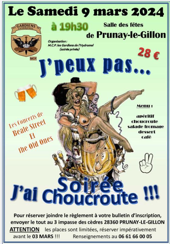 |  QUE DIRE DE CETTE CHOUCROUTE ! |  | Un grand merci à nos bénévoles, et à nos Girls Power ! avec qui nous avons réussi cette soirée , Merci à nos supers cuistos qui ont réussi cette choucroute . Merci à nos convives . Merci au MC les Compadres MC Les Motor Show Merci aux Tailleurs de Brume et aux Copains Bikers Merci aux Groupes de Musiciens , Les Olds One et Beale Street, pour ce bon moment musical . Encore un très bon moment que nous avons passé ensemble, déjà en tête